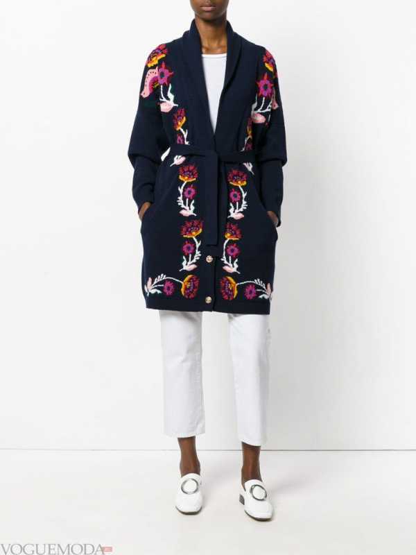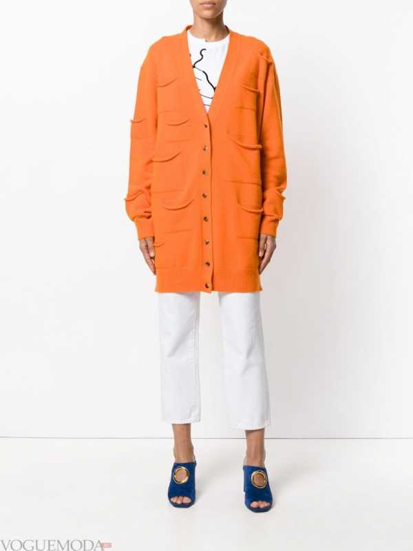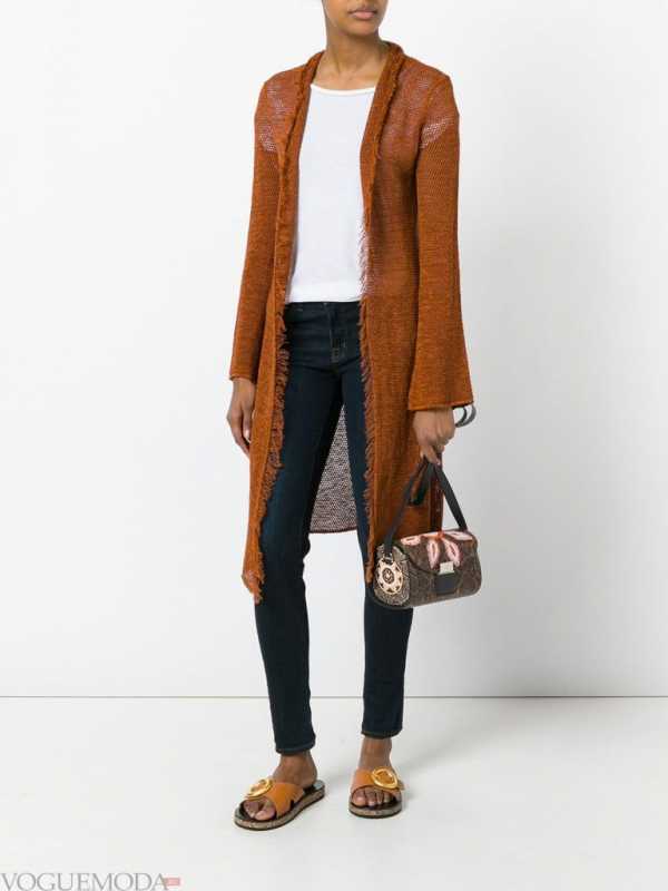 Для 2019 2020 года предложено множество фасонов кардиганов. Это может быть теплая вязанная накидка в стиле оверсайз из гладкого или фактурного полотна. Низ изделий часто украшается бахромой разной длины. Такие накидки выглядят очень элегантно и женственно. Их можно удачно вписать в деловой и повседневный гардероб.