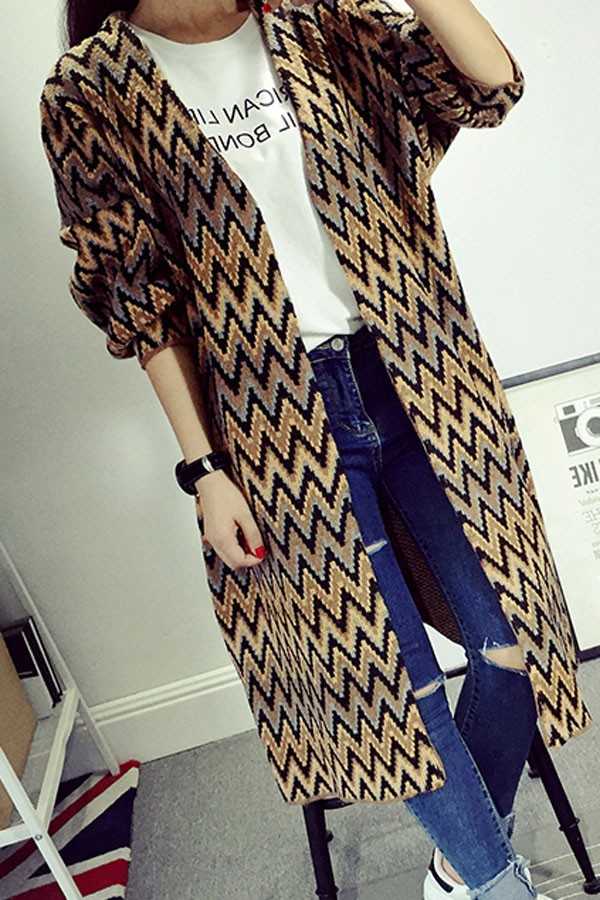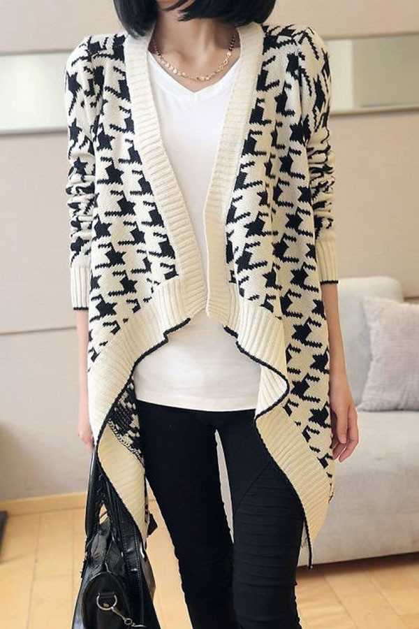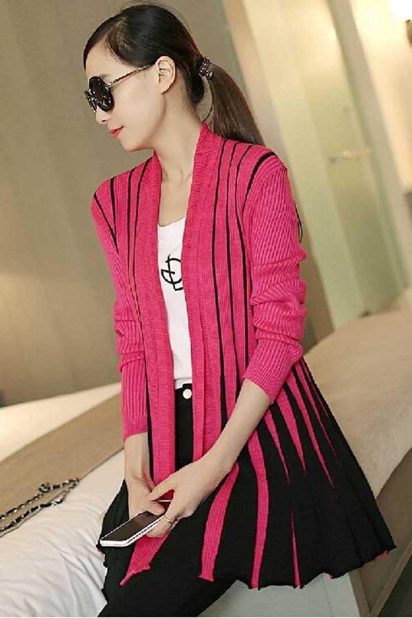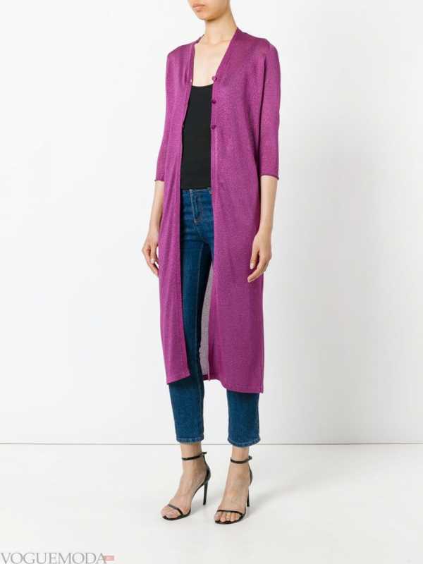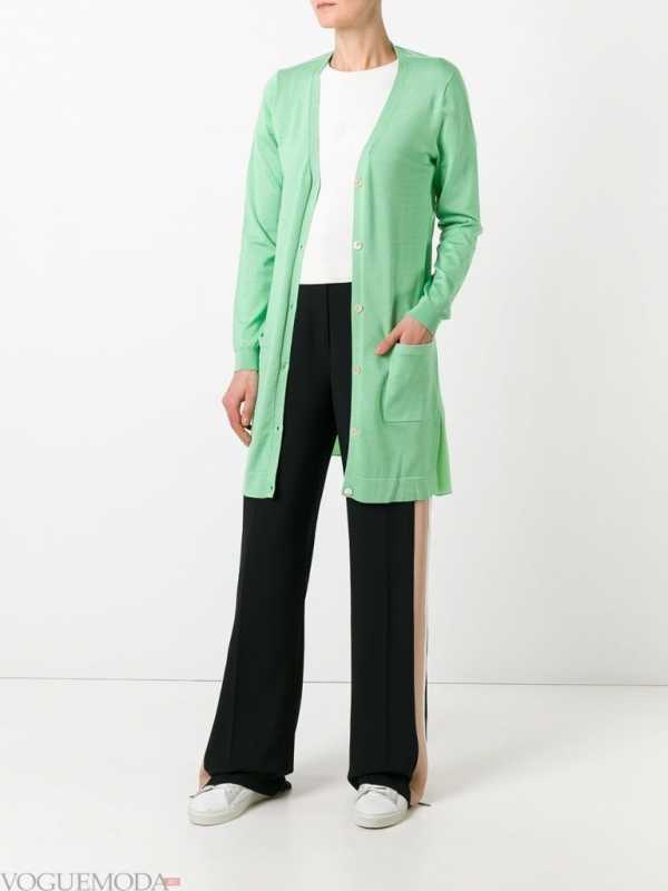 Длинные кардиганы могут иметь различные застежки в виде пуговиц, молний или просто пояска. В объемных моделях линия плеч подчеркнута подплечниками, которые снова входят в моду.