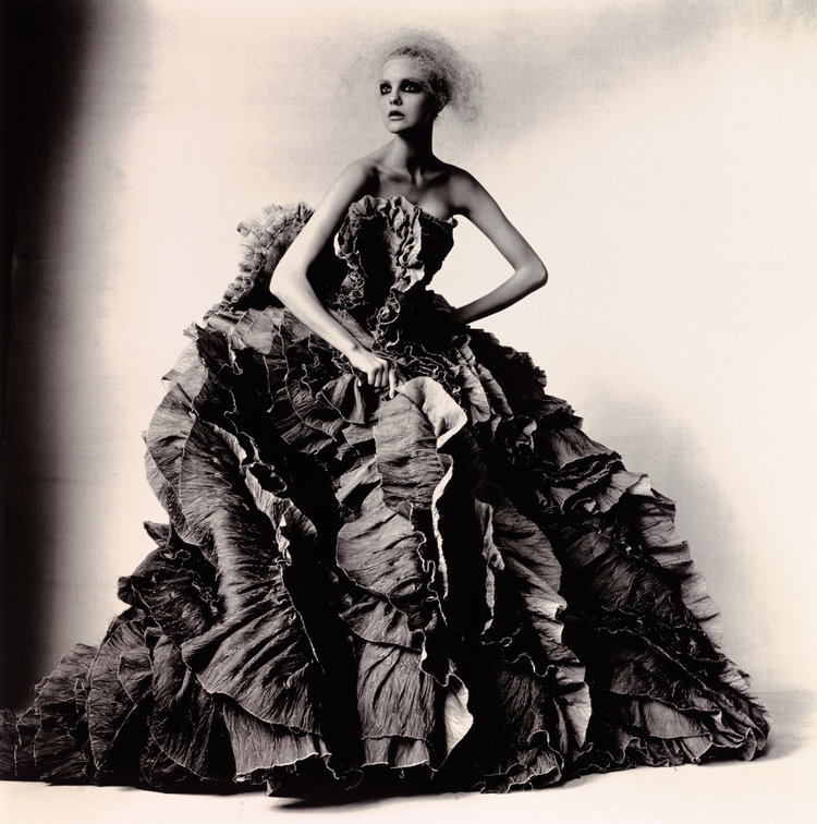 Простые, утонченные и мощные, как сухой мартини, культовые обложки Ирвинга Пенна для журнала Vogue продемонстрировали четкие линии и зауженные талии послевоенного Парижа и Нью-Йорка и преобразились. эстетика модной индустрии. Пенн удалил из кадра все, кроме одежды и модели. Его драматически освещенные фигуры — это, по сути, живые, дышащие скульптуры.