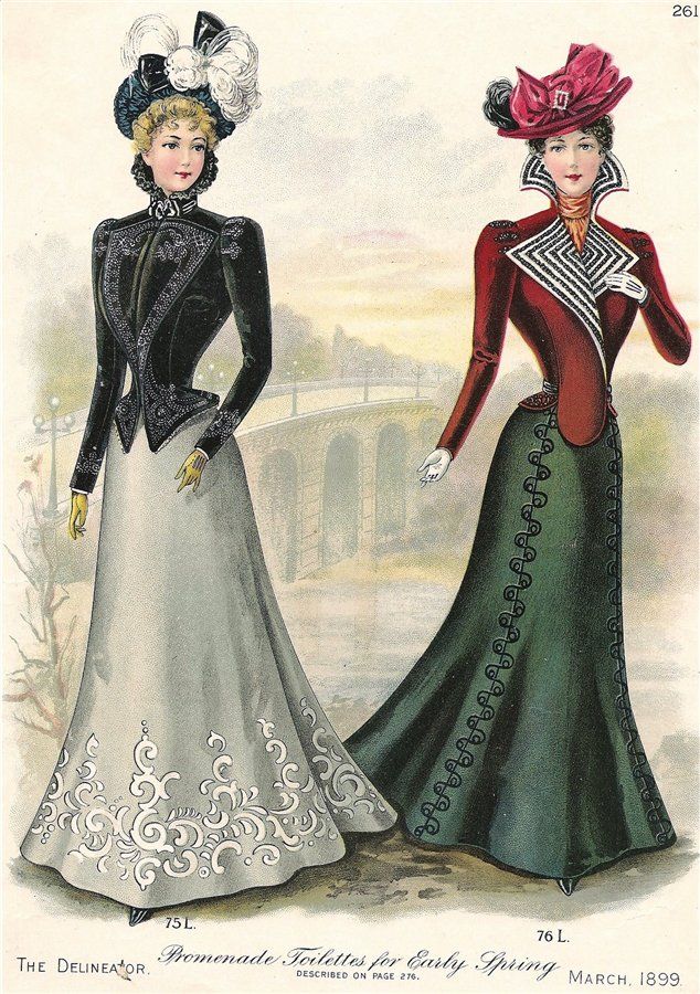 | Повседневная одежда 1896 Дама носит сшитое на заказ «прогулочное платье». Типичными для середины 1890-х годов являются большой рукав «баранья ножка», узкий лиф, небольшая оборка на спине (все, что осталось от турнюра) и гладкая расклешенная юбка. Джентльмен носит цилиндр и сюртук, которые уже более сорока лет являются официальной одеждой. Черный установлен в качестве стандартного цвета для формального платья, и мало что изменилось, кроме таких деталей, как длина лацкана и изгиб хвоста. Он носит высокий накрахмаленный воротник. |