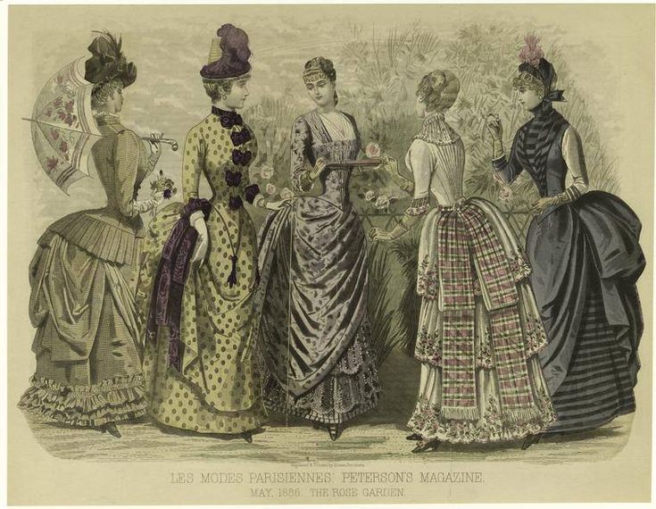 | Повседневная одежда около 1872 (слева) Это платье описывается как «морской костюм». Присборенная «верхняя юбка», поддерживаемая «кринолетом», делает спину самой важной деталью. Материалы легкие, а швейная машина позволила пришить большое количество плиссированной отделки. Яркая шляпа сидит на огромном пучке, вероятно, частично сделанном из накладных волос. Вечерние платья отличались только декольте и почти без рукавов. Мужчина носит неформальный домашний костюм, по форме напоминающий пальто с вырезом. Он носит более удобный отложной воротник, галстук с узлом и шляпу-котелок с низкой тульей. На фото справа – дама около 1870 года. Обратите внимание на плиссированный лиф, узкий высокий воротник и узкие рукава с отделкой. | |