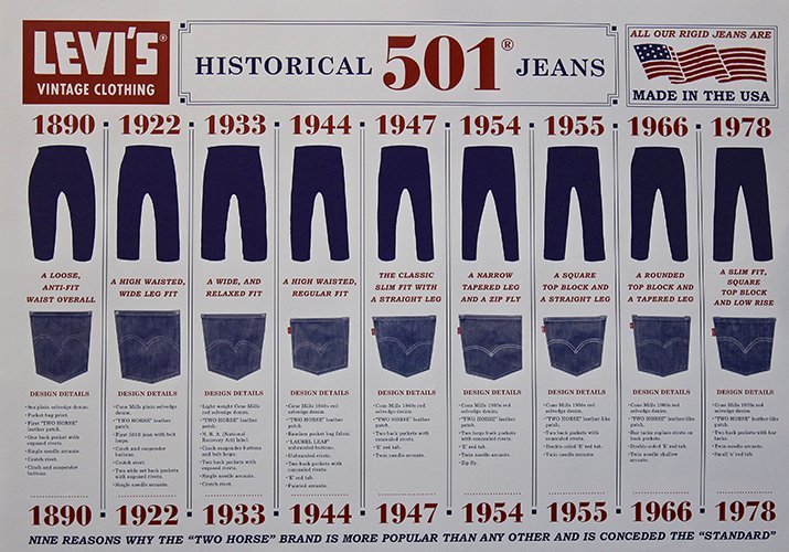 До этого времени ткань окрашивали натуральными красителями, что увеличивало конечную себестоимость и конечную цену товаров. 1886 год принёс легендарной модели 501 отличительный знак в виде кожаной этикетки с рисунком. На ней были изображены 2 жеребца, которые растягивали в разные стороны пару джинсов. Спустя 4 года появились классические джинсы с маленьким карманом. Он предназначался для часов и мелких монет.