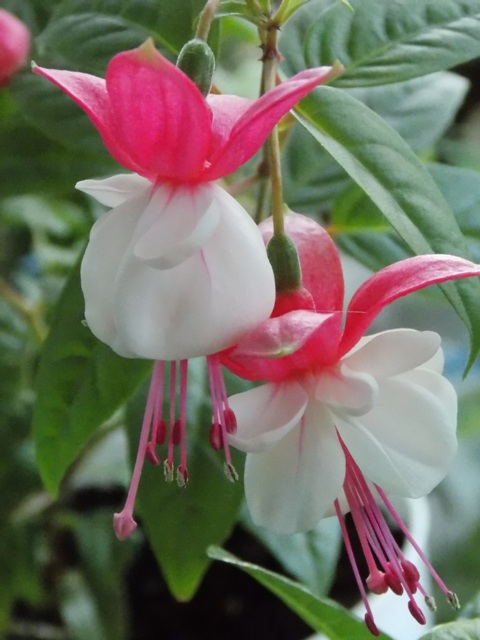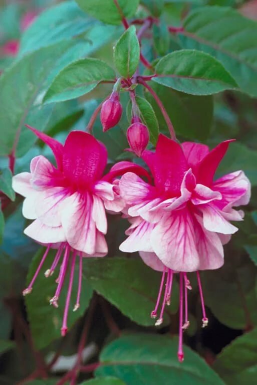 Существует большое количество сортов фуксии.Листья Фуксии ярко-зеленые, вытянутой овальной формы и заостренные на конце. Стебель светлый, а черешки листьев с красноватым отливом. В большинства сортов располагаются попарно.