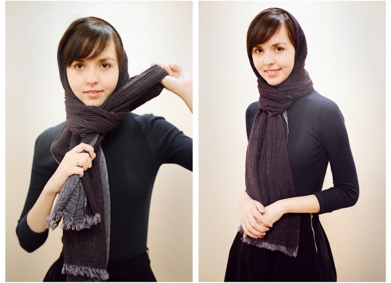 - Вам понадобится два шарфа контрастного цвета — нижний и верхний. Поднимите волосы. Покройте голову платком, оберните вокруг шеи, оставив свободные концы сзади.