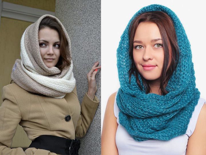 - В холодную погоду можно использовать одновременно два шарфа-хомута. Один надеть на шею, а второй на голову. Получится объемный, стильный и очень теплый наряд. Для такого случая выбирайте контрастные сочетания цветов.