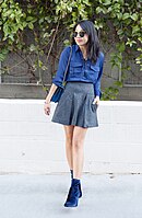 Стильные расклешённые юбки позволяют скрыть дефекты фигуры, особенно в её нижней части. Чаще всего пышная юбка дополняется узкой верхней частью. Иногда переход между двумя элементами одежды дополняется ремешком или поясом.