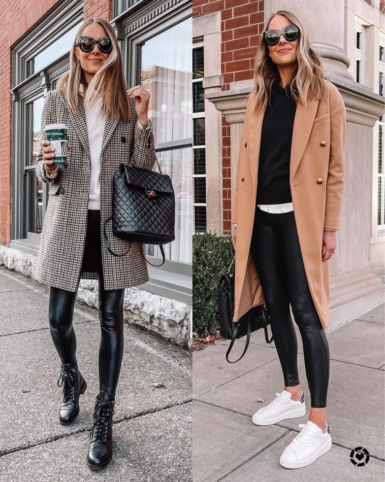 Этот вид верхней одежды удивителен тем, что с его помощью можно стильно сочетать направления. Очень красиво и сексуально смотрятся кожаные образы в одном стиле. В этом случае стоит подобрать облегающий гардероб и обувь на каблуке с острым или зауженным носком. На вопрос, с чем носить классическое пальто из кожи стилисты предлагают и гардероб гранж – ботинки на платформе, капроновые колготки с фактурным или кружевным узором. Модели ярких оттенков отлично дополнят молодежные луки с аккуратной обувью на каблуке и легкой юбкой-солнце с броским принтом.