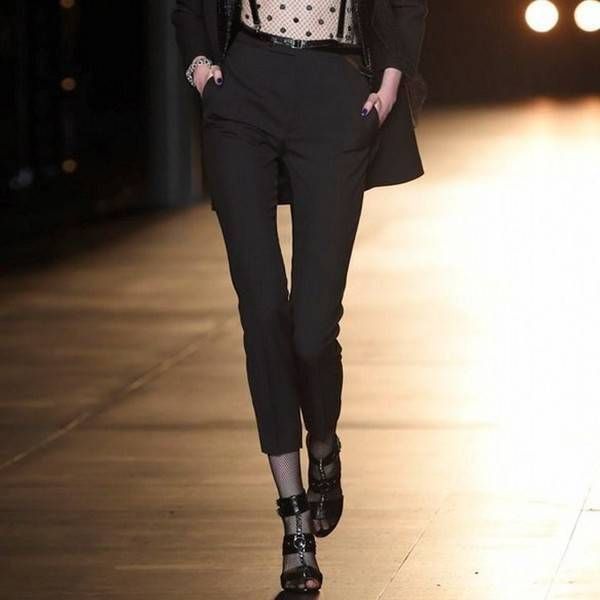 Наиболее эффектно смотрятся прямые чёрные или тёмно-серые укороченные брюки со стрелками – они отлично впишутся в офисный дресс-код.