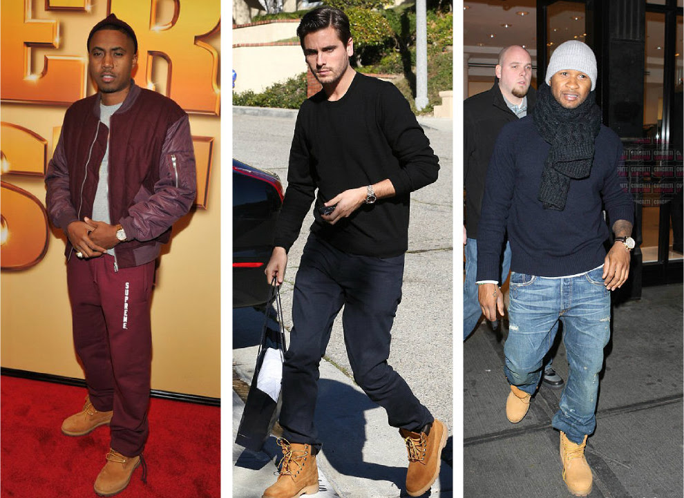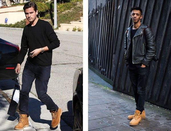 Вопрос об актуальности так же не стоит, о чем можно судить по звездным лукам. Как и у женщин, почти классикой стало сочетание желтой обуви с синими джинсами в кэжуал-стиле. Футболки, майки или рубашки поверх них гармонично завершают образ. Популярен и стиль хип-хопа, когда мешковатый верх и широкие приспущенные штаны брутально завершаются расшнурованными тимберлендами.