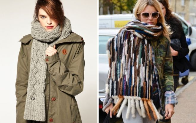 - Огромный шарф (похожий на шаль), накинутый на плечи. Особенно хороши для коротких моделей. Его также можно закрепить брошью.