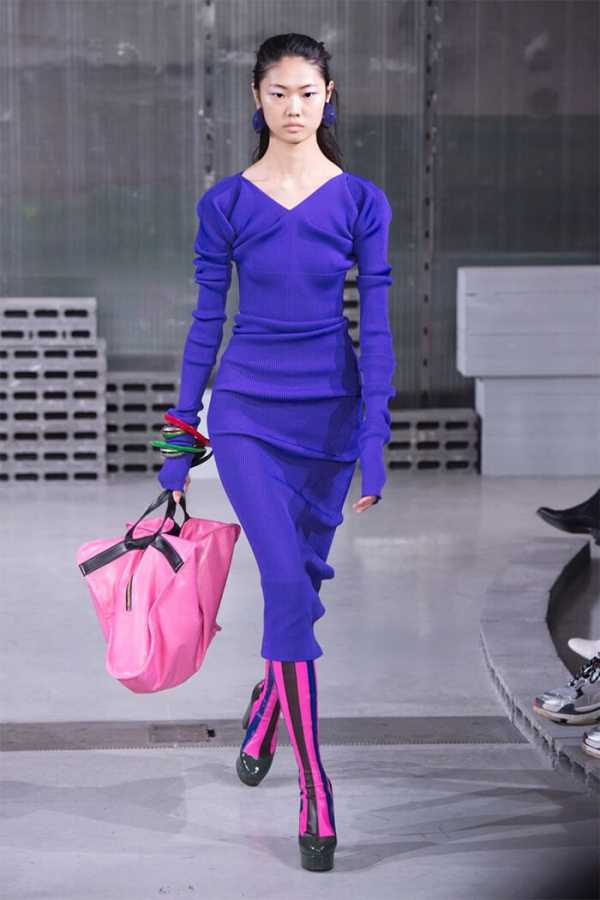 Модель с показа Marni осень/зима 2018-2019Основное достоинство таких платьев – возможность показать фигуру более стройной, сделать девушку визуально выше ростом. Модели с серединой в одном цвете и двумя контрастными вертикальными полосами по бокам придают плавности пышным формам.