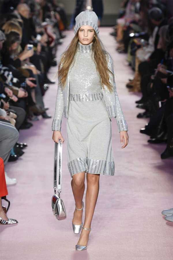 Модель с показа Anouki осень/зима 2018-2019Серебро не любит других броских деталей, смещающих с него основной акцент. Подчеркнуть самодостаточность, эксклюзивность такой расцветки лучше всего темными приглушенными тонами в аксессуарах, обуви, верхней одежде.