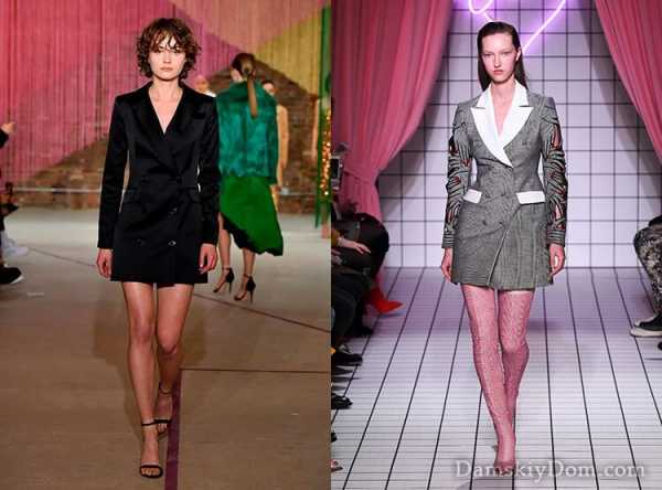 Модель с показа Barbara Bui осень/зима 2018-2019Самая популярная длина – мини или чуть выше колена. Прямые линии, строгость кроя и цвета делают платье-пиджак подходящим для офисной среды, деловых встреч, рабочих мероприятий. Хорошо и стильно смотрятся темные тона, узоры в крупную клетку. Для праздника, вечернего выхода, прогулки можно выбирать оригинальные асимметричные фасоны, наряды, декорированные пайетками, стразами, с яркими расцветками.