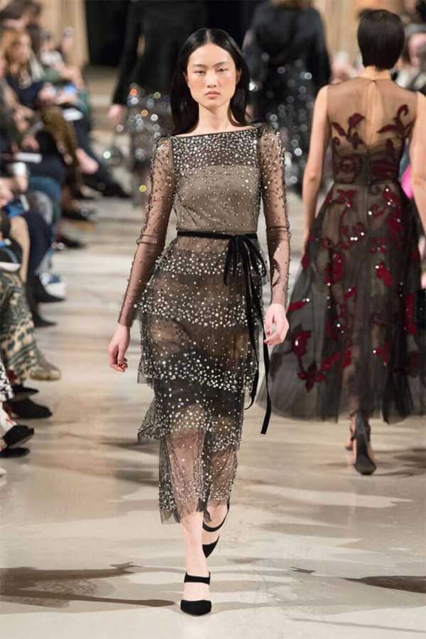 Модель с показа Alberta Ferretti осень/зима 2018-2019Поскольку платье с блеском – довольно яркая одежда, то компанию ей лучше составить из темных выдержанных аксессуаров и обуви. Приглушить светящиеся тона смогут удлиненные однотонные пиджаки, пальто из плотной ткани. Для создания заметного праздничного образа, например новогоднего, платья с крупными стразами или светоотражающими частичками подойдут больше всего.