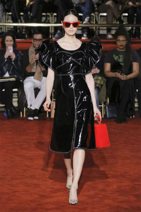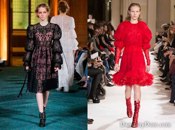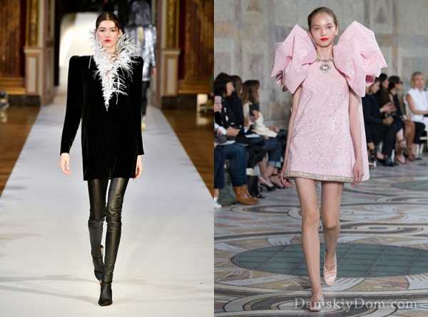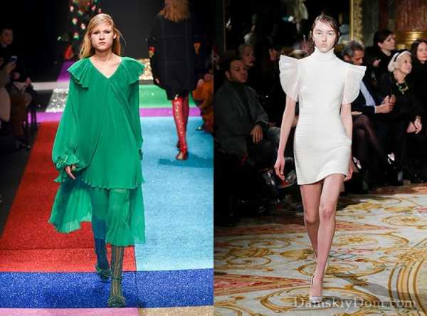 Еще одной яркой, оригинальной деталью платьев осенне-зимнего сезона 2018 становится объемный верх. Для этого дизайнеры дополняют наряды массивными плечами, сделанными в форме воланов, бантов, крыльев бабочки. Длина платья варьируется от мини (для обладательниц стройных ног) к макси (для тех, кому необходимо скрыть некоторые недостатки фигуры).