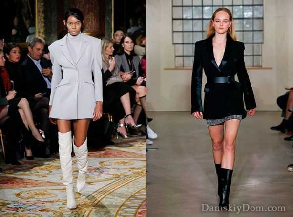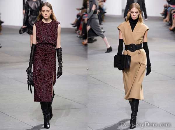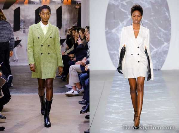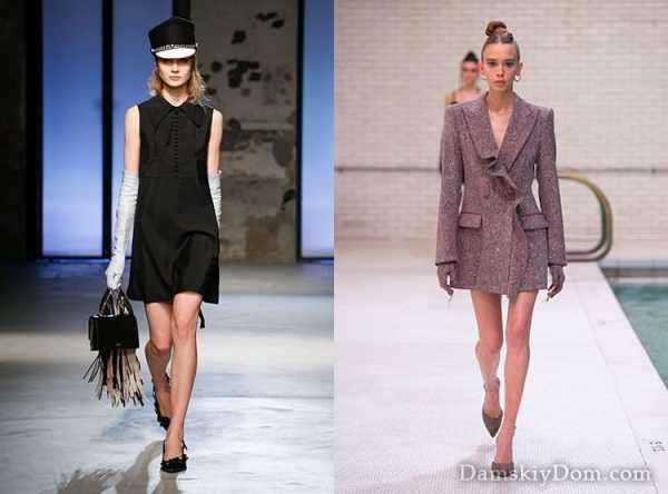 Его мы сразу узнаем по частоте встречаемости в прошлых сезонах: платье-блейзер и здесь нашло себе достойное место. В топе – двубортные блейзеры базовых цветов, а также сочетание разных по фактуре материалов: кожи и твида, костюмных тканей и атласа. Отдавая предпочтение приталенным фасонам, обращаем внимание на широкие кожаные пояса с массивными металлическими пряжками. Новшество сезона осень-зима 2018-2019 – платье-блейзер с элементами кейпа – и здесь нам снова понадобятся кожаные перчатки длиной по локоть.