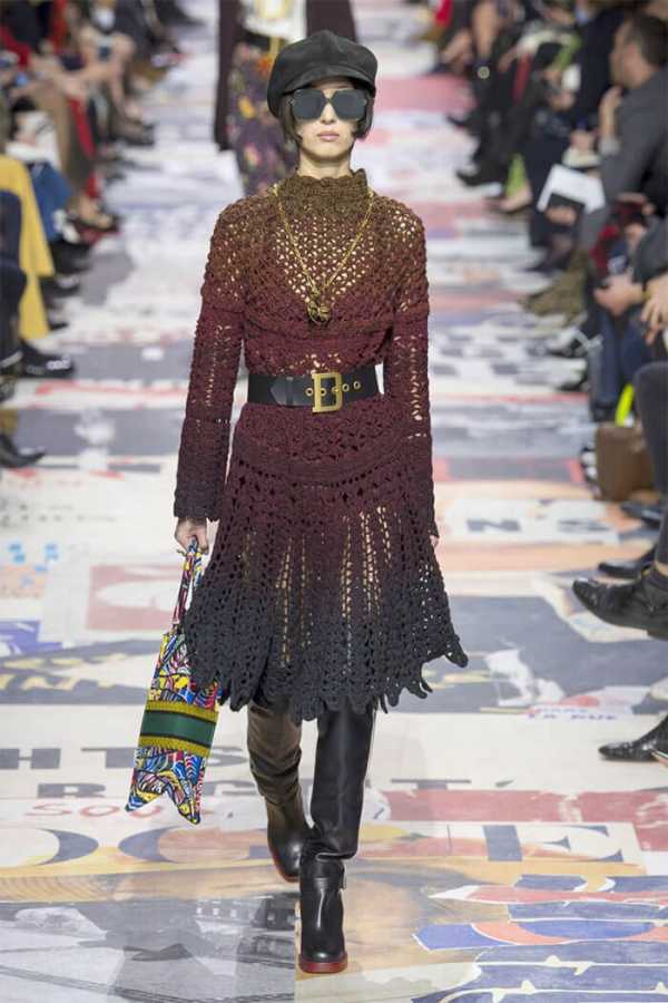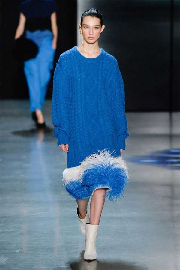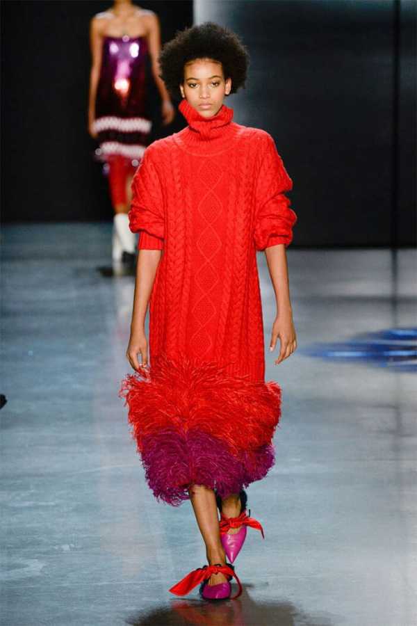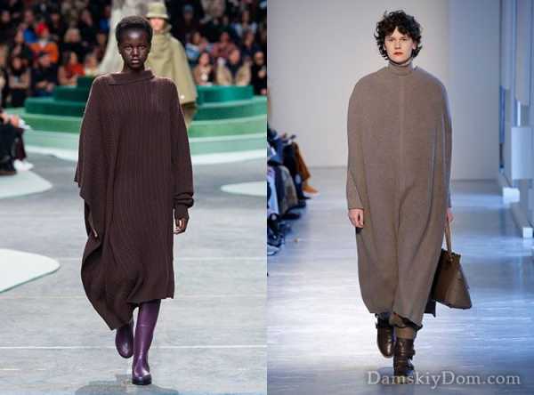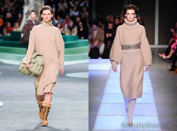 Объемные свитера крупной вязки в сезоне осень-зима 2018-2019 сменяют уютные и максимально комфортные шерстяные платья длины миди и макси. Принцип тот же: высокий воротник-воронка или хомут, широкие рукава (на заметку берем актуальный в этом году епископский рукав или овечья ножка), узоры из шерстяных нитей. Дополняем бахромой, мехом, кожаными вставками или надеваем вниз гофрированную юбку, которая будет слегка выглядывать из-под стильного вязаного платья.