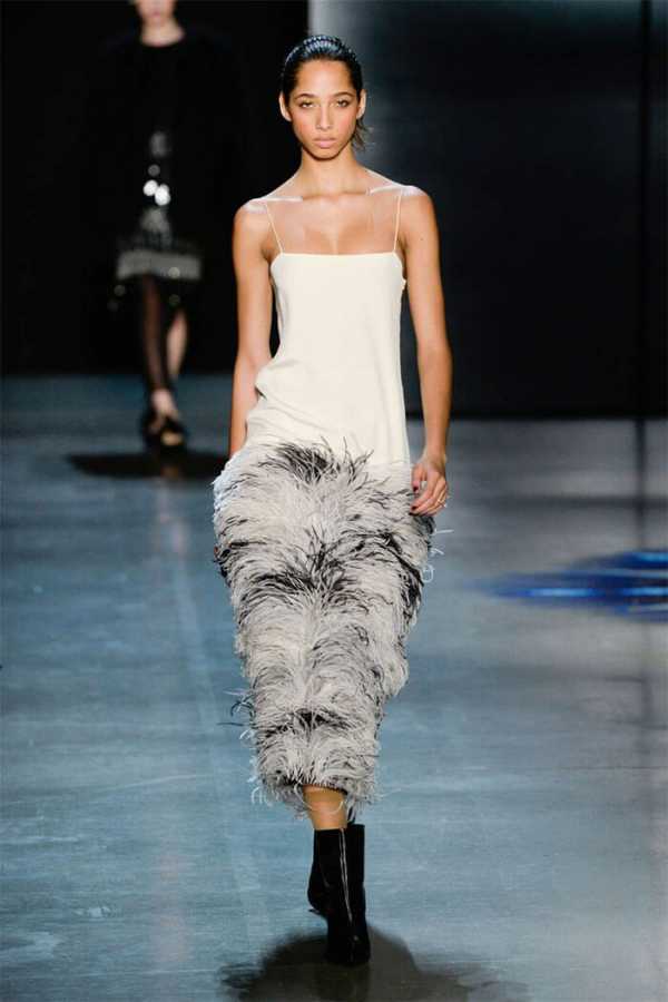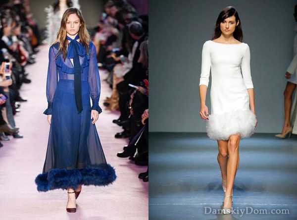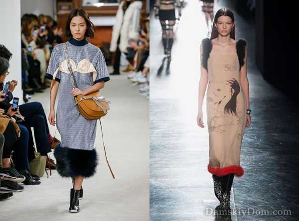 Мы уже успели убедиться, что мех правит бал в новом сезоне. И платья не составили исключение, а наоборот – приняли новый тренд во всех его проявлениях. Мех встречается повсеместно: в виде окантовки рукавов и отделки низа, вдоль и поперек изделия, отдаленно напоминая будуарные пеньюары. Сочетаемость нового декоративного элемента радует, образуя интересные комбинации как с плотными шерстяными тканями, так и с полупрозрачным шифоном.