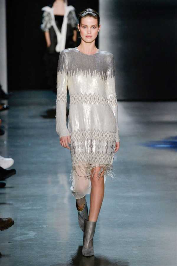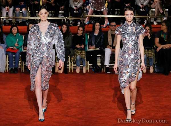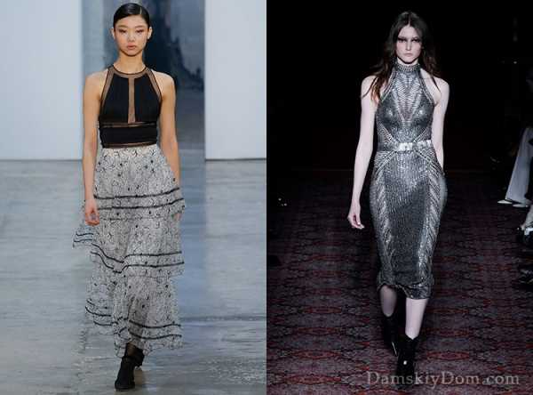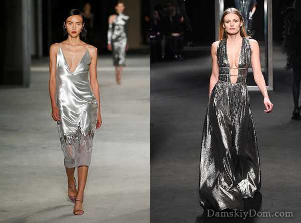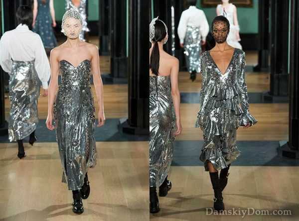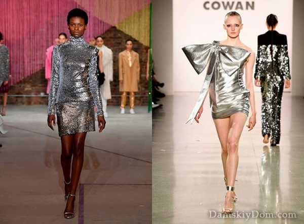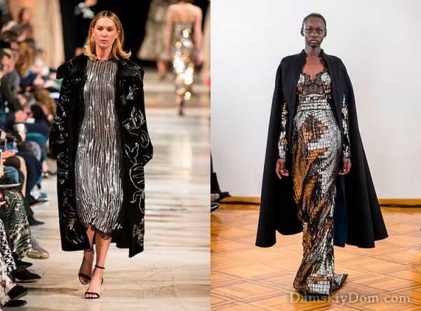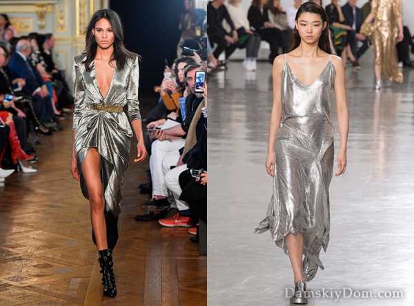 В зимнюю моду 2019 года прекрасно впишутся платья с холодными серебристыми переливами. Металлический блеск придаст образу не только яркости, но и загадочности, неприступности. А многослойные детали помогут добавить объемов на бедрах или линии груди.