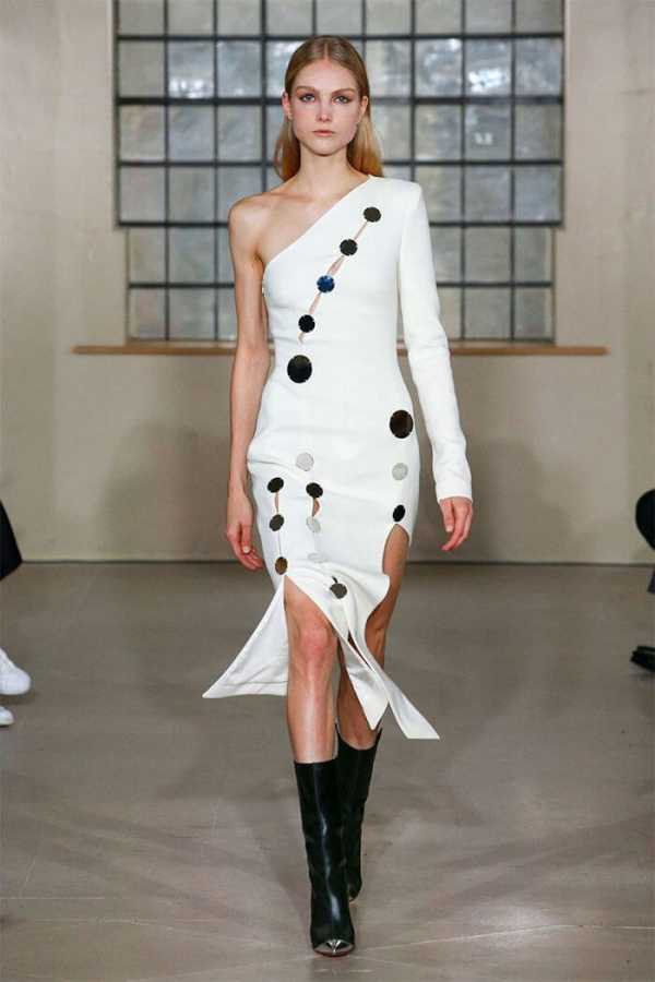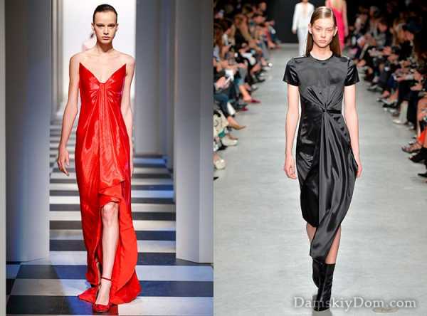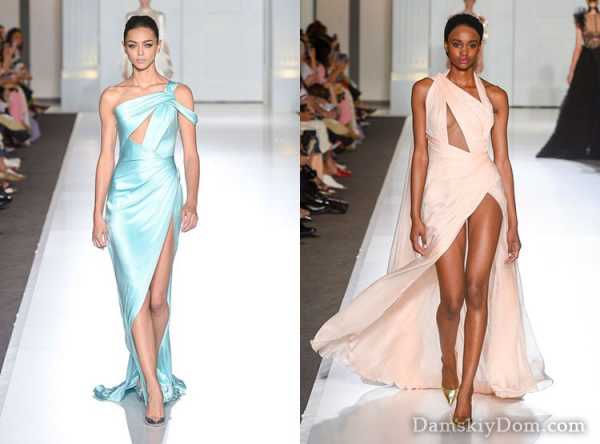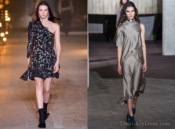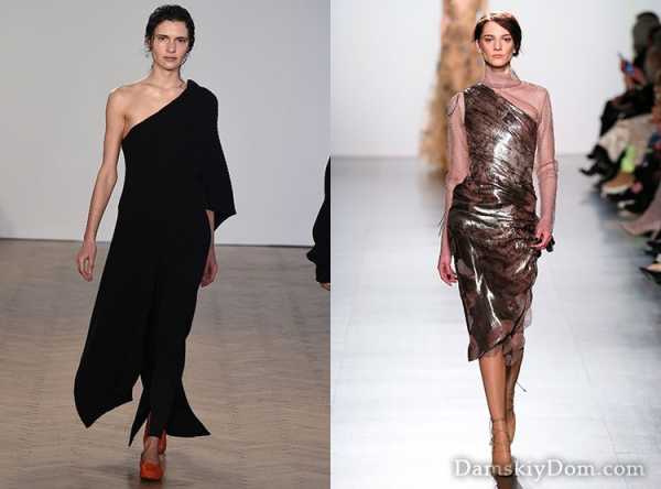 Ещё одна тенденция, которая успешно кочует из сезона в сезон — это асимметричные платья. В этом году в моде преимущественно наряды с одним оголённым плечом, а также со сложной драпировкой.