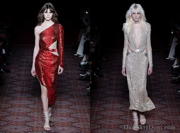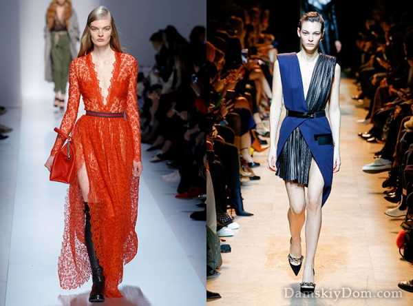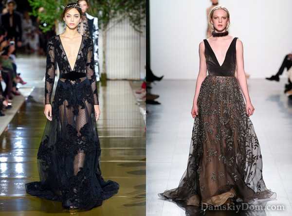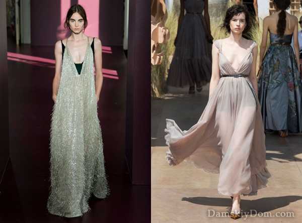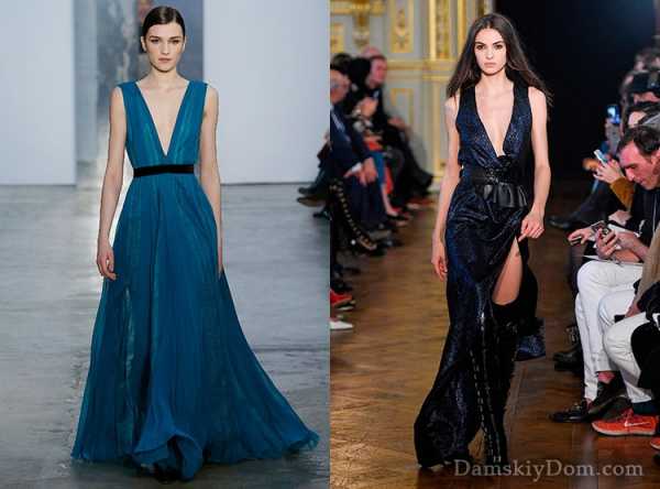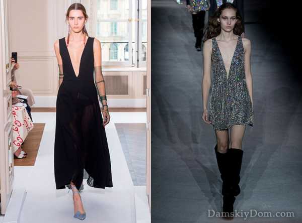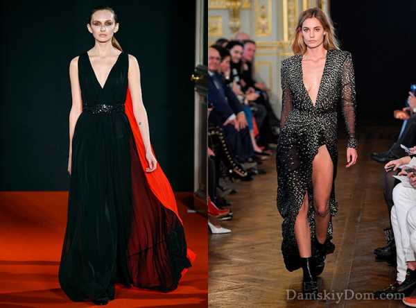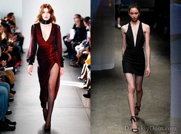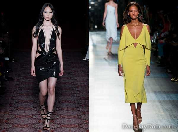 Ставим «галочку» напротив первого из списка модных трендов! И им является V-образный вырез, причем в новой его интерпретации. Мы уже говорили о крайностях и о том, что дизайнеры в этом году воспринимают все буквально. Именно поэтому линия лифа выходит за рамки: на вечерних и коктейльных платьях она заканчивается на талии, где ограничителями, как правило, служат пояс, кокетка или сборка. Такие фасоны нередко сочетают в себе несколько видов тканей, за счет чего создается эффект фактурной игры: благородный бархат и летящий шифон, изысканный гипюр и атлас, сетка и мерцающая ткань с пайетками, плотные плательные ткани и кожа. Обычно такие модели не терпят стремлений открыть еще что-нибудь, хотя диагональный разрез юбки от бедра вполне допустим. Что касается аксессуаров, то данный фасон большой потребности в них не испытывает: несколько лаконичных браслетов не предплечье, серьги, ниспадающие с плеч, или кружевной чокер на шее – этого будет достаточно.