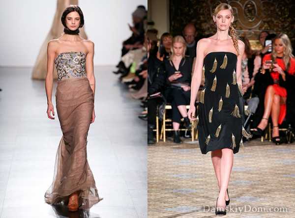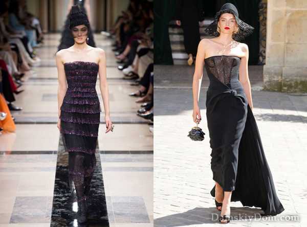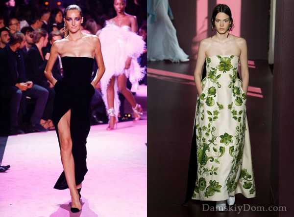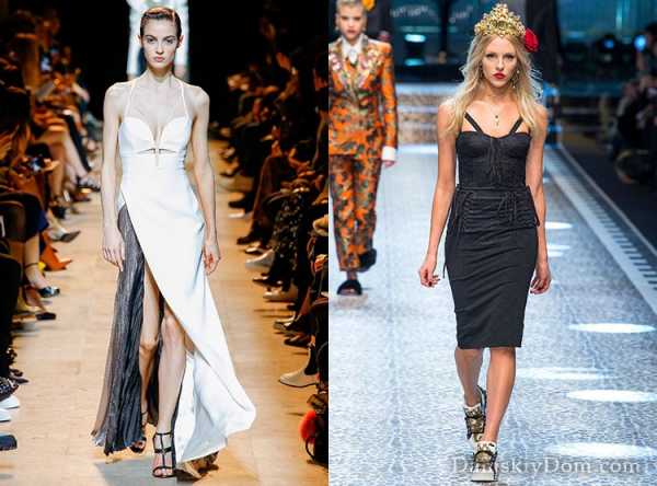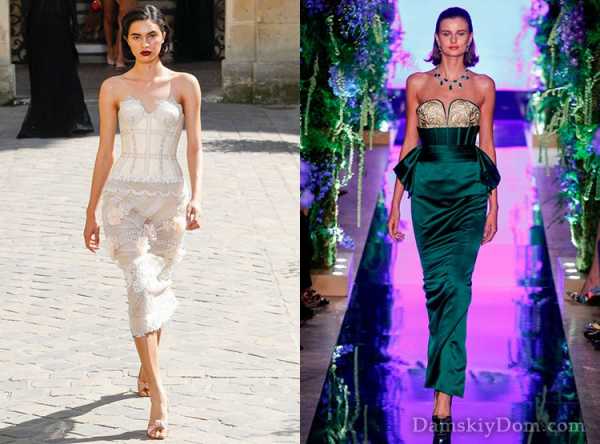 Нечто среднее между элементом нижнего белья и лифом бального платья – декольтированные по вырезу горловины модели, которые уже входят в классическое представление об изысканном вечернем туалете. Тонкие бретели или их отсутствие открывают линии шеи и плеч, визуально вытягивая её, — и это не единственный секрет. Такой фасон может моментально подкорректировать фигуру, превратив ее в «песочные часы»: вырез в форме «сердечка» сужается к талии, где, как правило, расположена тонкая кокетка или пояс, после чего переходит в широкую юбку (возможен также и такой вариант, как пышная пачка) или юбку-тюльпан (объемная в бёдрах, но сужающаяся к коленям). Результат – мгновенно преобразованная фигура и идеально четкий силуэт.