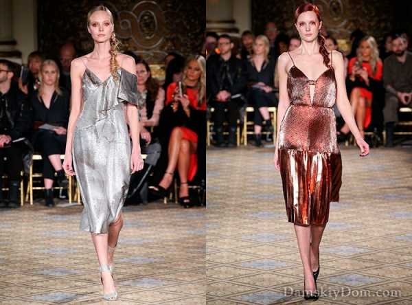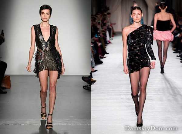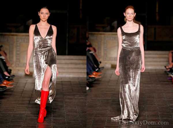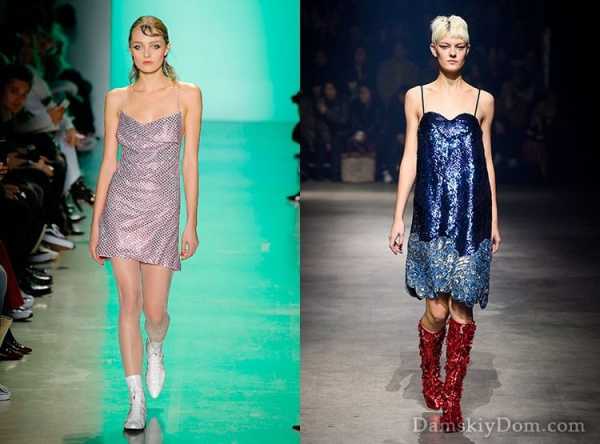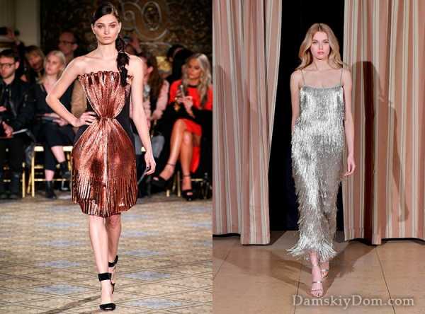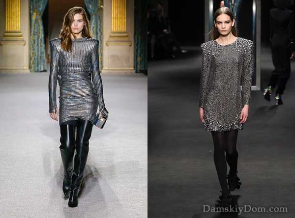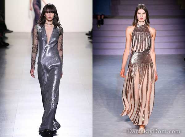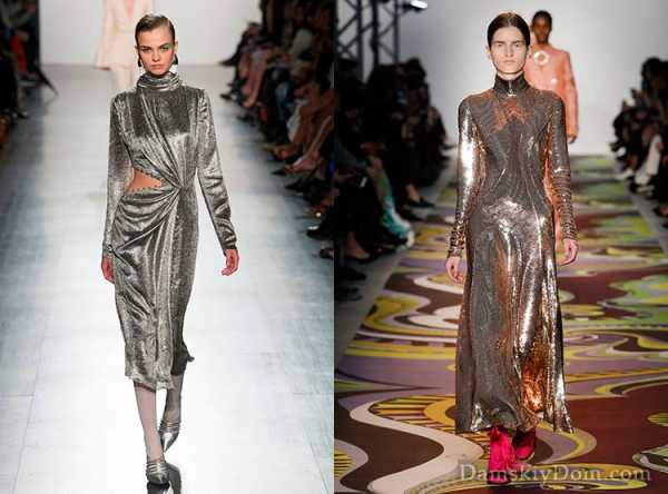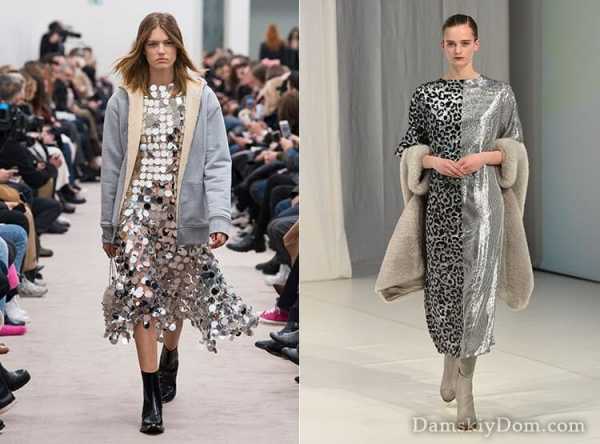 Дизайнеры и в этом сезоне не упускают возможности добавить блеска в свои коллекции. Такие платья явно созданы для того, чтобы привлекать внимание, ловить на себе восторженные взгляды и комплименты. В коктейльном и вечернем образе допустимо сиять на максимум, особенно благородными переливами драгоценных металлов. Самый популярный вариант – холодный серебряный оттенок, который лучше всего вписывается в атмосферу зимнего сезона, напоминая наряд Снежной Королевы. А растопить лед поможет простая однотонная пара обуви: в данном случае лучше вернуться к классике, сделав выбор в пользу стилетов или обыкновенных лодочек.