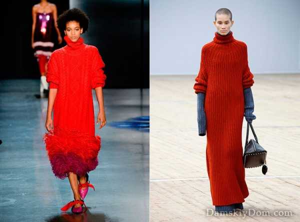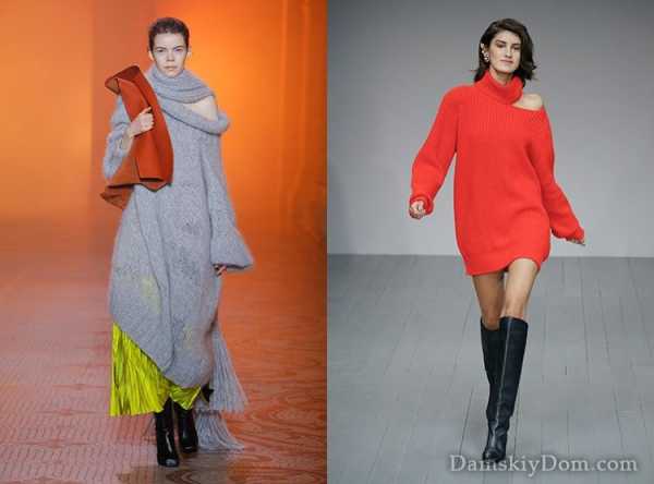 Даже в самую холодную зимнюю стужу вас прекрасно согреет платье-свитер, которое будет очень популярно зимой 2017-2018. Толстые и невероятно мягкие материалы, что используются для пошива платьев данного стиля, помогут вам ощущать тепло и комфорт даже в морозную погоду. Кроме привычных платьев в виде свитера, будущей зимой в моде будут платья с горловиной. Практичным вариантом повседневной осенне-зимней являются вязанные платья-водолазки макси-длины. Хотя, важно отметить, что короткие платья с горловиной также востребованы.