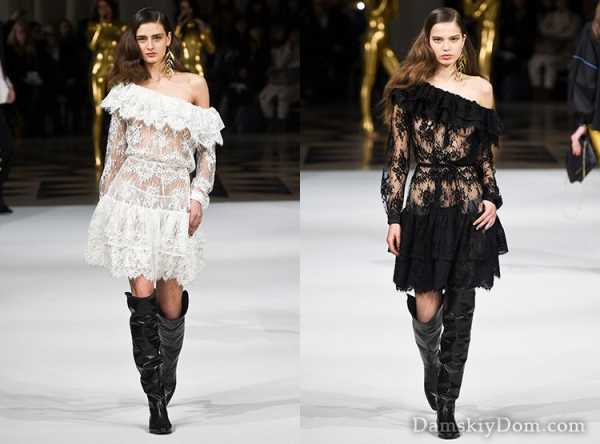 Асимметрия всегда в тренде – и актуальной деталью вашего образа может стать платье с открытым плечом. Изобретение не новое, однако, смотрится всегда оригинально и смело, причем разрешено оно и в повседневных образах, и в праздничных. Выбрав черное платье-мини на одно плечо, можно собрать ультрамодный аутфит в рок-стиле, дополнив его массивными черными ботинками или лаковыми полусапожками, плотными колготками и курткой-косухой. Получить обратный эффект, в противовес бунтарскому духу, поможет легкое гипюровое платье с драпировками и воланами, которое можно смело сочетать с кожаными ботфортами и теплым, тяжеловесным на вид пальто.
