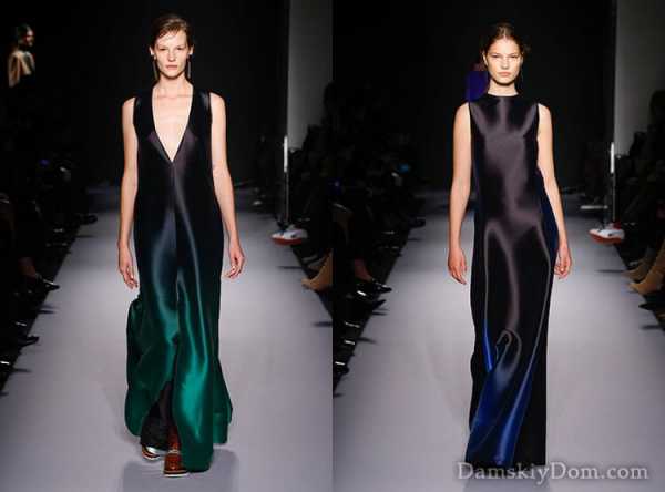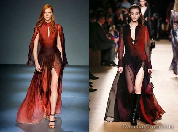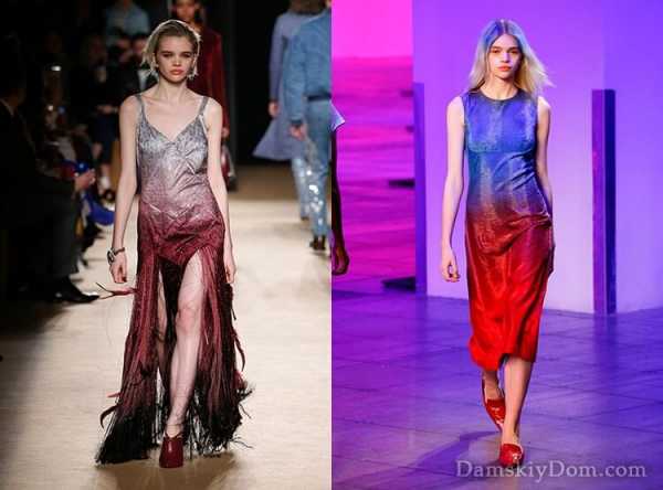 Тотальное размывание цвета и градиент – в авангарде модных трендов осень-зима 2018-2019. Переходы совершаются как в рамках одной цветовой гаммы, так и в палитре совершенно противоположных оттенков. В центре внимания – шелковые ткани разных фактур: от глянцевого атласа до невесомого полупрозрачного шифона. Идея для безупречного вечернего образа – темная цветовая гамма с переходом от черного к приглушенному изумруду или синему. Кроме того, вариации в бордово-красном, сиреневом и шоколадном.