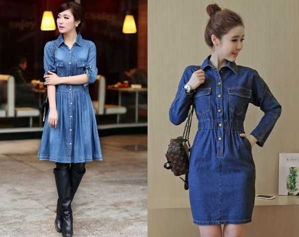 Джинсовые платья не только невероятно модные, но и чрезвычайно удобные. Если вы выберете обувь на низком ходу, например ботинки, кеды или кроссовки, то ваш образ будет не только красивым, но и очень комфортным. Используйте по максимуму этот универсальный тренд, пользуйтесь возможностью примерить на себе десятки образов с помощью одного единственного платья. Джинсовое платье — просто замечательный холст, на котором с помощью аксессуаров можно проявить свой стиль, вкус и настроение. Добавляйте яркие акценты, сочетайте с контрастными жилетами и пиджаками, выбирайте кеды или грубые ботинки: так вы получите образ, используя всего одно платье. Наиболее популярным фасоном джинсового платья бесспорно стало платье-рубашка. Носить его можно с поясом или в свободном виде. Если рукава платья длинные, то лучше будет закатить их до локтя, так образ будет выглядеть более расслабленным. Джинсовое платье-рубашка уместно будет смотреться на работе в офисе, оно подойдет для встречи с друзьями, свидания или просто прогулки. Как офисный вариант отлично подойдут джинсовые платья прямого силуэта с поясом на талии и воротником-стойкой. Хорошо выглядят модели с юбкой-колокольчиком в сочетании с застегнутой на все пуговицы горловиной. Такой стиль беби-долл пойдет молодым девушкам, и весьма актуален будет в университете благодаря достаточно официальному, закрытому воротнику.