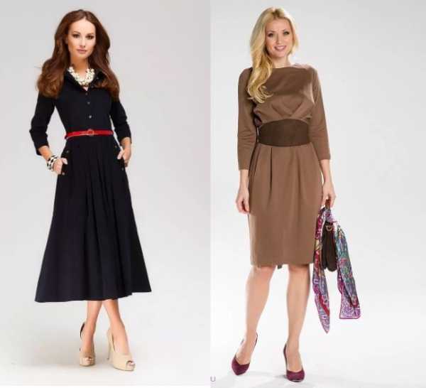 Сочетание этих цветов не выходит из моды уже многие годы. С их помощью можно визуально скорректировать фигуру, подчеркнуть женственность, безупречный вкус. Осенью и зимой стоит обратить внимание на платья из плотных тканей, с завышенными горловинами.