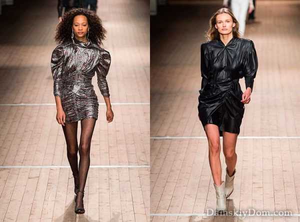 Модель с показа Isabel Marant осень/зима 2018-2019Подойдет такой наряд в большей степени для девушек, обладающих длинными ногами и стройными фигурами. Некоторые недостатки фактуры и роста способны скрыть высокие каблуки или крой платья. Кожаные короткие платья подойдут для раскованных и смелых персон. Они отлично будут смотреться на вечеринке или вечерней прогулке.