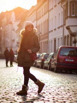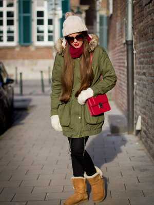 Угги хорошо носить с пуховиком, паркой, балониевой курткой и даже коротким пальто.