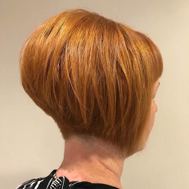 Такой вариант боба прекрасно подходит обладательницам рыжих волос. Эффектный объем на теменной части головы, аккуратные линии стрижки на затылке и челка А-формы создадут обворожительный образ.