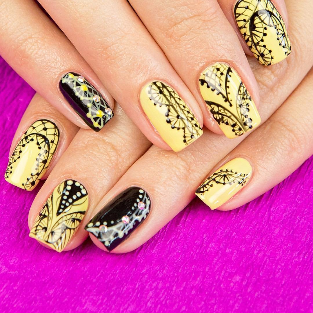 Мастера предлагают использовать полупрозрачные натуральные текстуры по всей поверхности ногтевой пластины, в то время как более интенсивные рисунки с черными полосками и золотым декором лучше всего будут смотреться в качестве акцента на парочке квадратных ноготков.