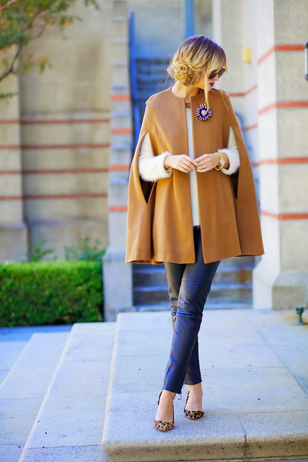 Ботильоны и ботинки на невысоком каблуке будут хорошо смотреться как с длинными, так и с короткими кейпами. Носите эту обувь с брюками, джинсами скинни и расклешенными моделями. Кейп – отличный способ создать многослойный образ, поэтому вы можете экспериментировать с его длиной и сочетаниями, надевая длинный свитер внутрь или объемный длинный шарф поверх кейпа.