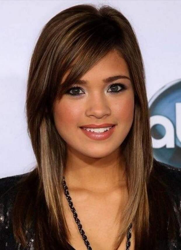 Если форма лица ближе к квадратной, лучше сделать косую градуированную челку в несколько слоев. Резкие и четкие линии в этом случае, наоборот, противопоказаны. Ее верхний угол должен быть как можно короче (1 – 2 см), а нижний – доходить до линии скул. Для овального лица желательно сделать пряди разной длины.