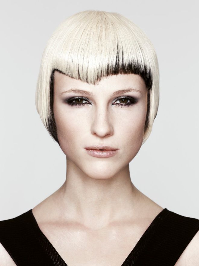 Графичная челка — идеально ровная, до бровей, сочетается только с такими же вытянутыми волосами. Это вариант для девушек с круглым лицом и мягкими чертами.