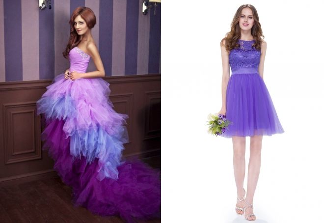 Нежное и воздушное короткое фиолетовое платье создано специально для кокетки. Оно подчёркивает все достоинства стройной фигуры и в зависимости от фасона может быть надето на выпускной вечер или просто на прогулку.