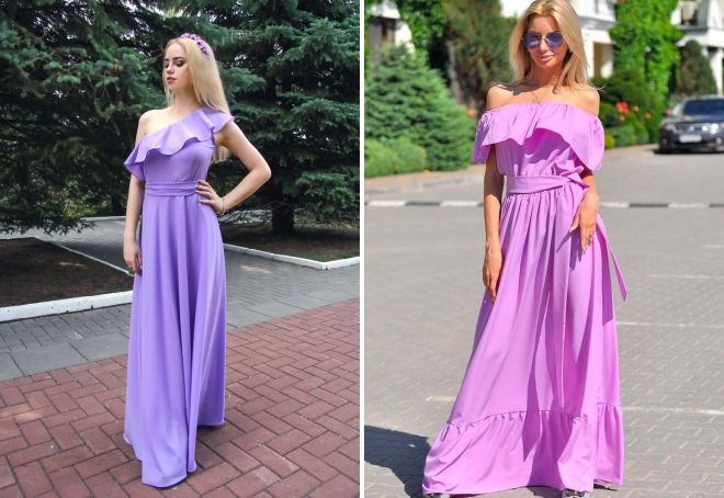 Подчеркнуть женственность и изящество можно с помощью такой вариации как стильное лиловое платье, декорированное воланами: