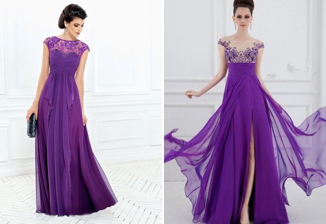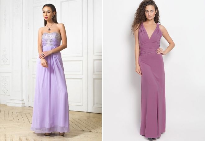 - популярным вариантом остается лиловое платье в греческом стиле;