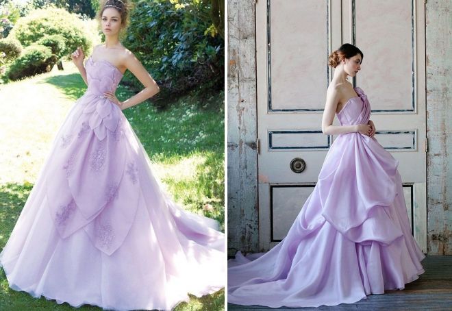 - красиво выглядит лиловое пышное платье, имеющее лямки, из которых завязываются банты;