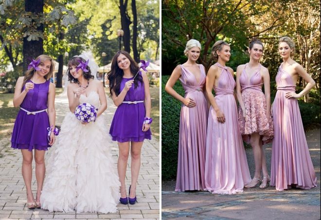 Иногда в платье используют так называемые переливы — родственные цвета, оттенки одного цвета. Так, сиреневый, фиолетовый и лавандовый эффектно смотрятся вместе.