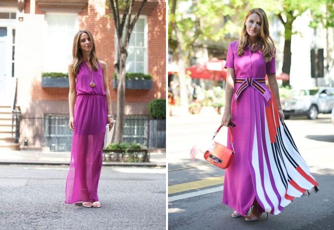 Летнее фиолетовое платье будет отлично смотреться с сумочкой, имеющей красные вставки, однотонной серой и жёлтой сумкой. При этом в тон к сумке можно подобрать ремень и обувь. Также летом не следует забывать про белый цвет и использовать белые аксессуары, которые помогут сделать образ ещё более женственным.