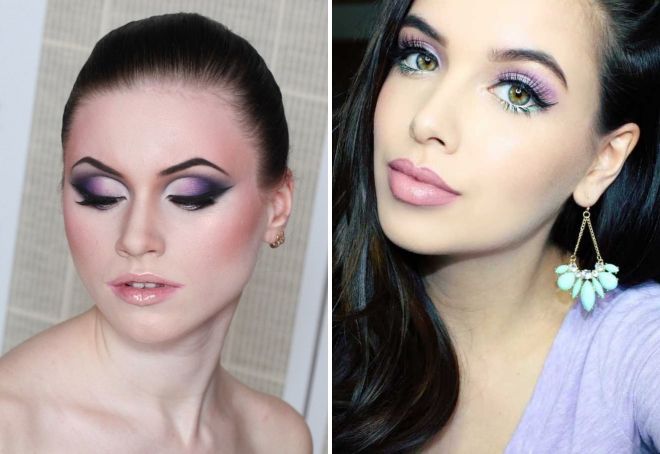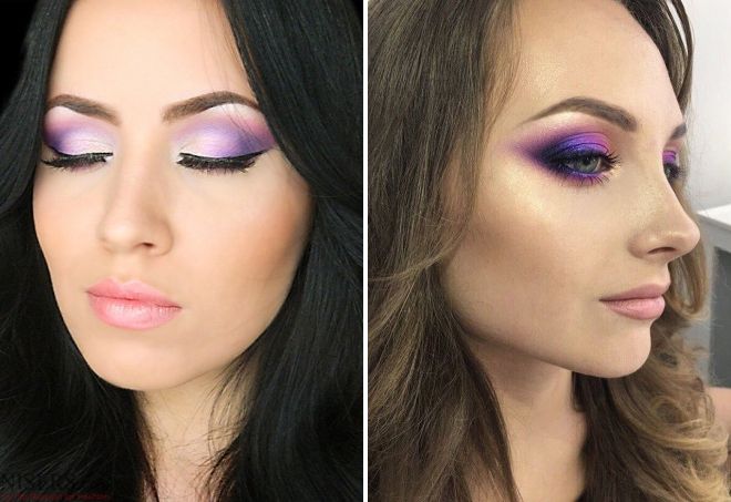 Выбор макияжа под фиолетовое платье зависит от цвета кожи. С фиолетовым отлично выглядит кожа светло-розового оттенка. При этом необходимо тщательно выровнять цвет кожи и скрыть всевозможные её дефекты. Цвет румян должен быть персиковым или розовым. Розовые и фиолетовые тени подойдут к зелёным и голубым глазам.