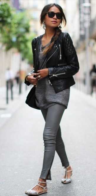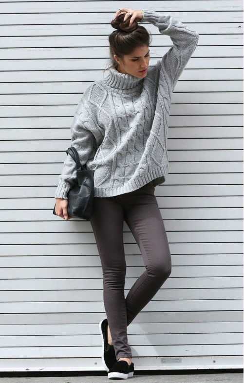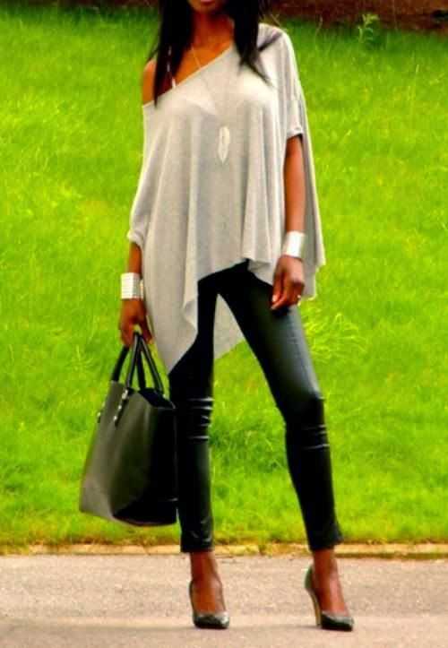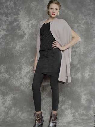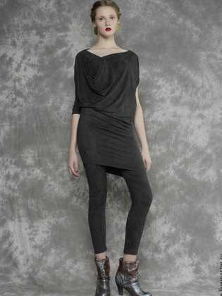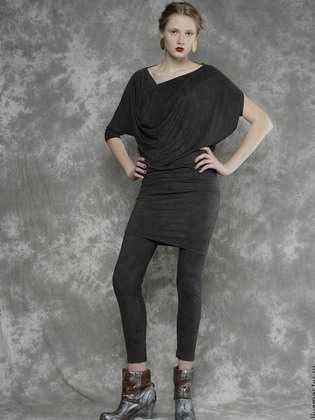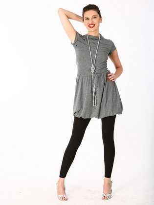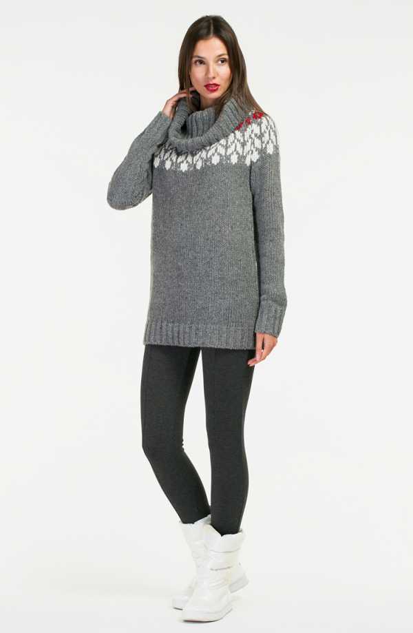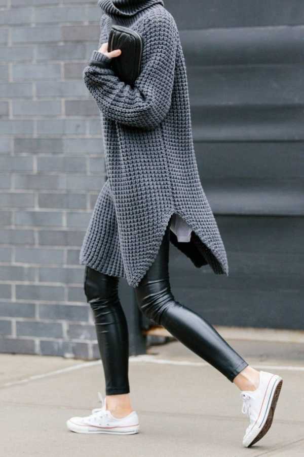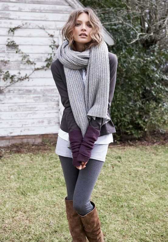 Удлиненные свитера и туники хорошо смотрятся с серыми лосинами любого оттенка. Цвет верха может быть абсолютно разным, а вот сапоги или ботинки лучше выбрать жемчужно-серые.