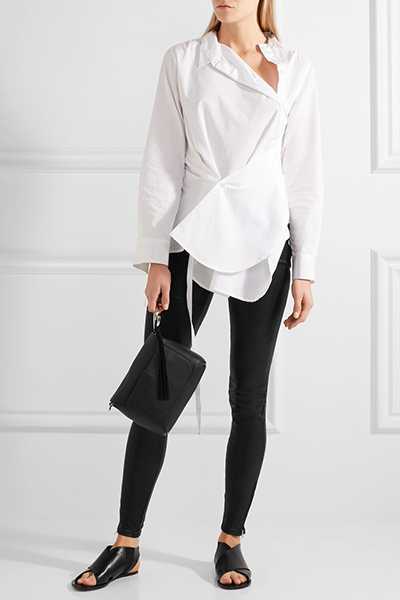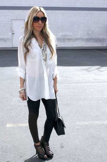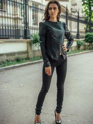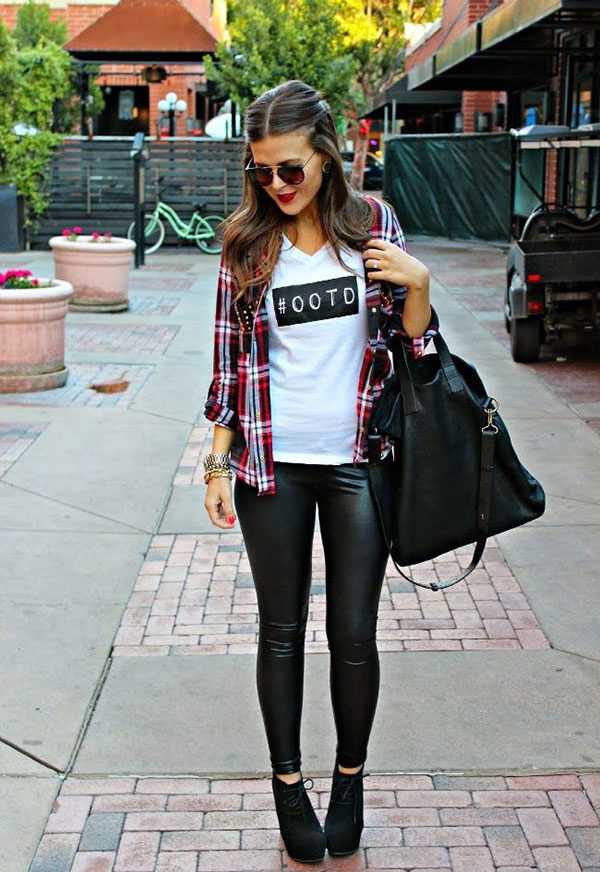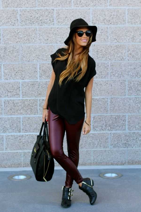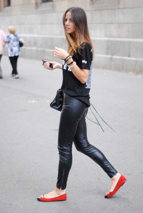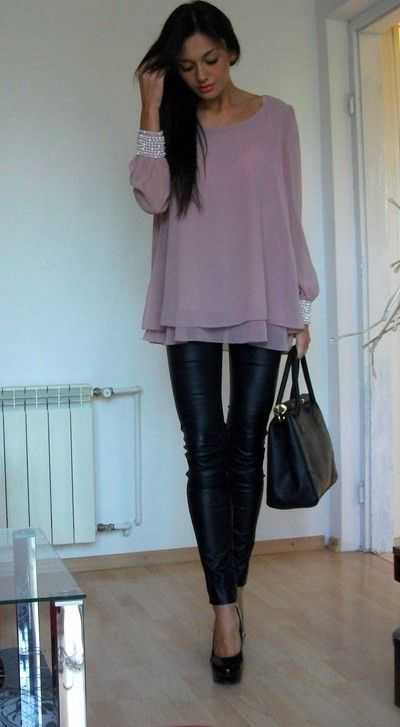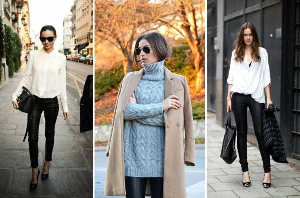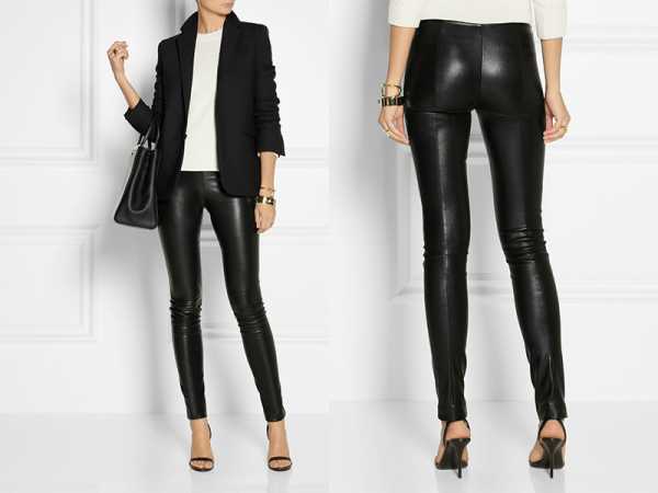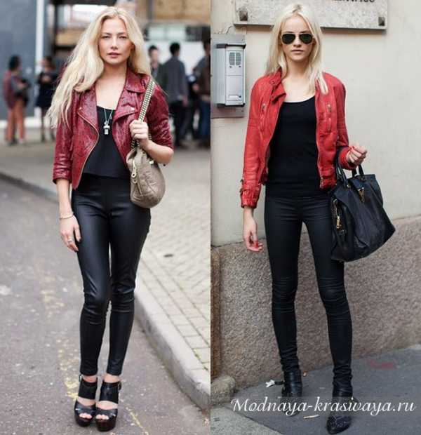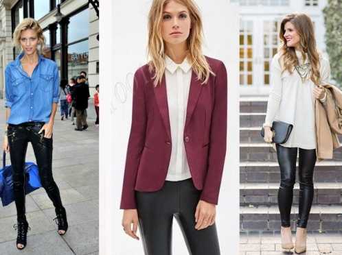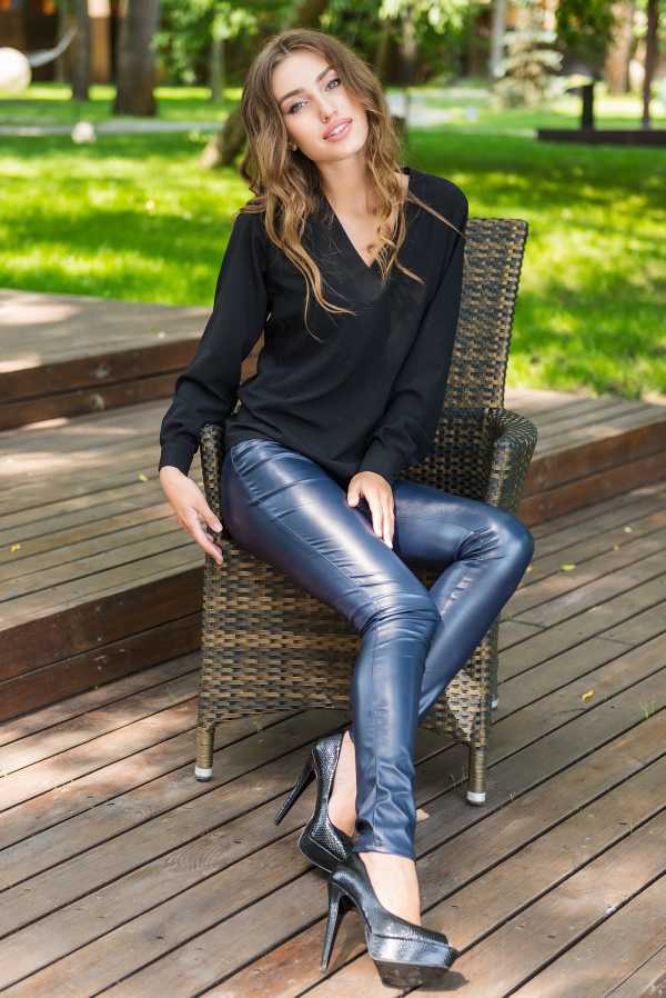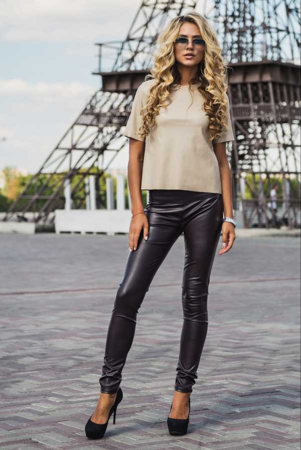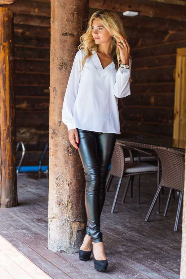 Гардероб смелых девушек, которые отдают предпочтение эпатажному образу, не обходится без кожаных лосин. Они прекрасно гармонируют с белыми или светлыми рубашками и блузками.