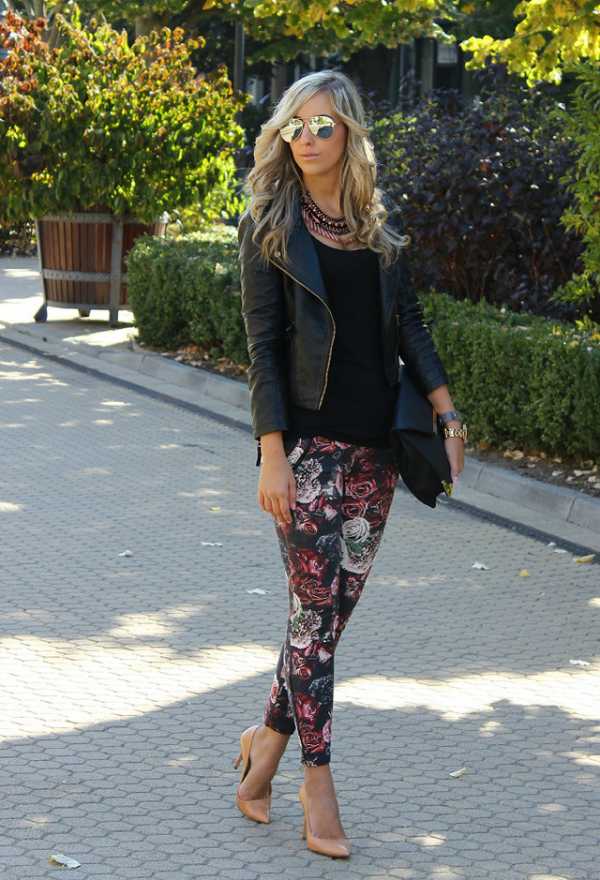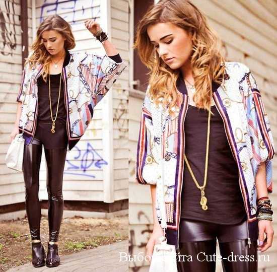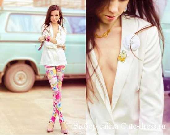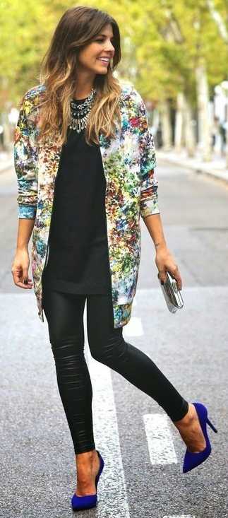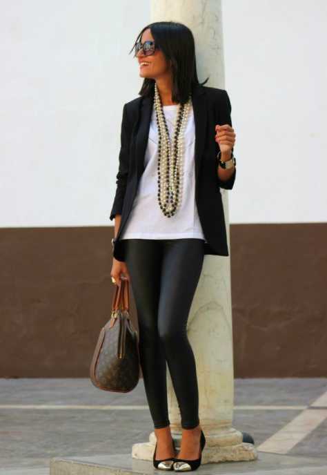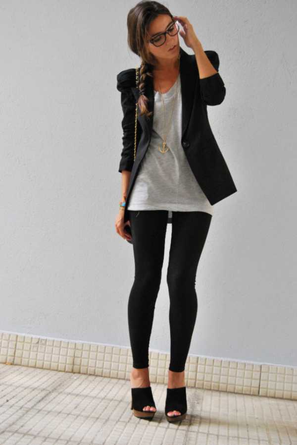 Яркий пиджак и черные лосины – хороший выбор для весенне-осеннего сезона. Под пиджак можно надеть майку или легкую однотонную блузку. В качестве обуви больше всего подойдет пара туфелек или босоножек на высокой или средней шпильке или же на платформе. Завершить стильный образ уверенной в себе девушки поможет яркая крупная бижутерия.