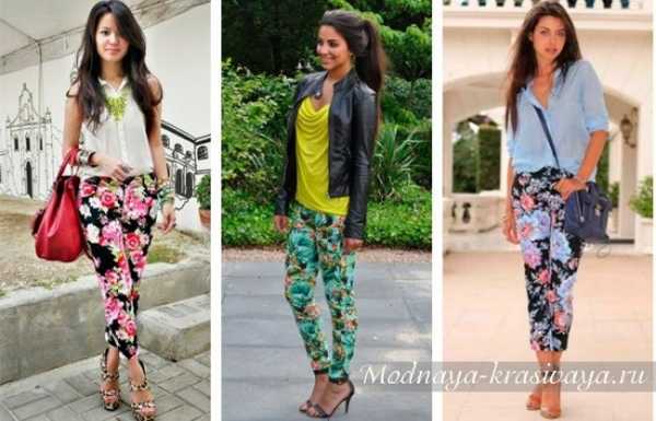Воплощение фантастических творческих идей при создании определенных образов дают неожиданные результаты. Создаются сногсшибательные луки и ультрамодные ансамбли, отличающиеся роскошью, изысканностью и креативным стилем. Применяя черные или белые брюки, дополненные верхом контрастных оттенков можно создать стильные деловые или рабочие образы. Игривость добавят в облик брюки в цветочек, с мультяшными героями, геометрическими абстракциями, поцелуйчиками, комбинированные с бежевыми или белыми майками и футболками. Уверенность женщинам придадут камуфляжные штаны с точечным рисунком, которые можно сочетать с зелеными, оливковыми или горчичными изделиями.